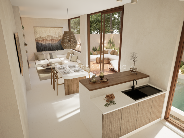 Located in the tranquil surroundings of Nyang Nyang, this beautifully designed one-bedroom villa provides the perfect blend of modern elegance and serene living. The villa features an open-plan kitchen and living area on the ground floor, offering direct access to a private pool and outdoor seating, ideal for relaxing in a peaceful atmosphere.