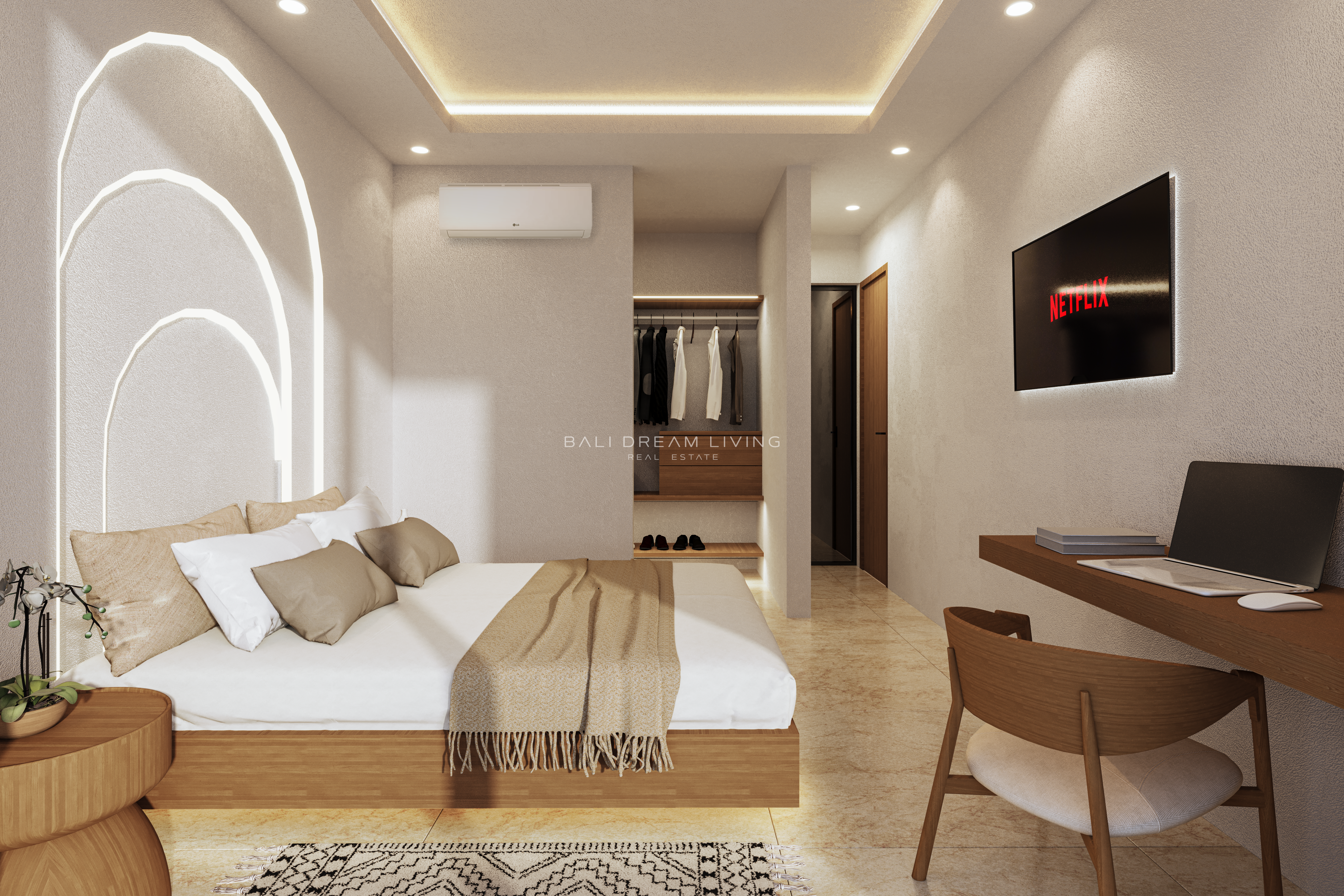 This exquisite 1-bedroom villa embodies the perfect harmony between modern Mediterranean charm and tropical elegance. Every element of the design has been thoughtfully curated to create a serene oasis that seamlessly blends indoor and outdoor living. The open floor plan allows for effortless flow, enhanced by natural materials and neutral tones that evoke a relaxing ambiance. Sunlight pours through floor-to-ceiling windows, filling the interior spaces with a warm, inviting glow.