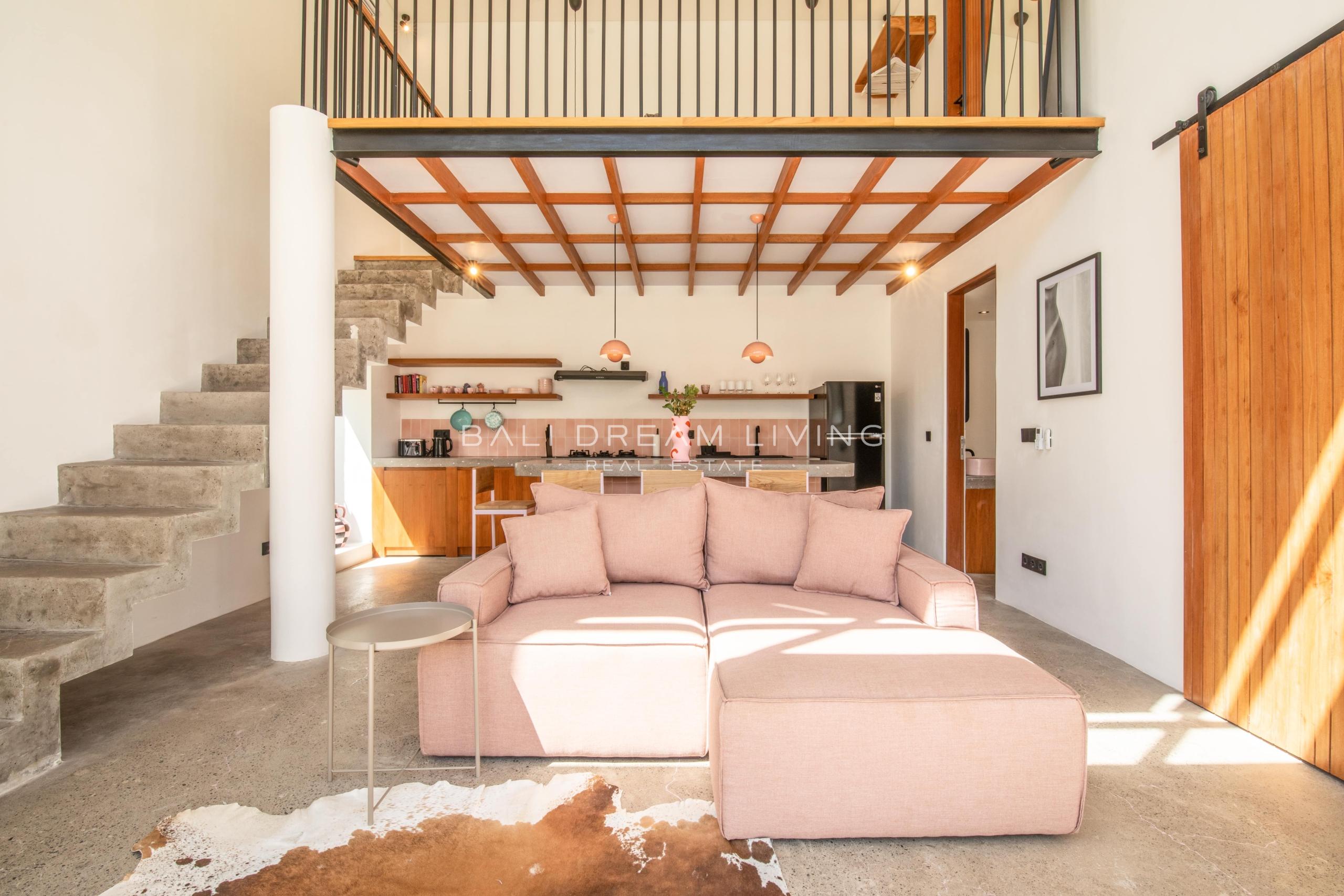 Located in the highly desirable area of Bingin, this beautifully finished two-bedroom villa offers the perfect balance of modern tropical living and sophisticated design. Thoughtfully arranged over two floors, the villa welcomes you with an expansive open-plan living and kitchen area, where soaring vaulted ceilings and abundant natural light create a fresh and airy atmosphere.