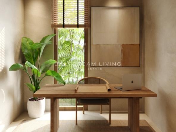 Spanning 110 square metres on a generous 120 m² plot, the villa showcases a breezy open-plan layout with expansive jungle views, elegant arched windows, and seamless indoor-outdoor flow. The living area is airy and bright, connecting effortlessly to a sleek kitchen and dining space. The master bedroom features a built-in wardrobe, custom lighting, and sliding glass doors that open to the outdoors. A second room is cleverly designed as either a guest bedroom or home office, ideal for modern living or rental flexibility.