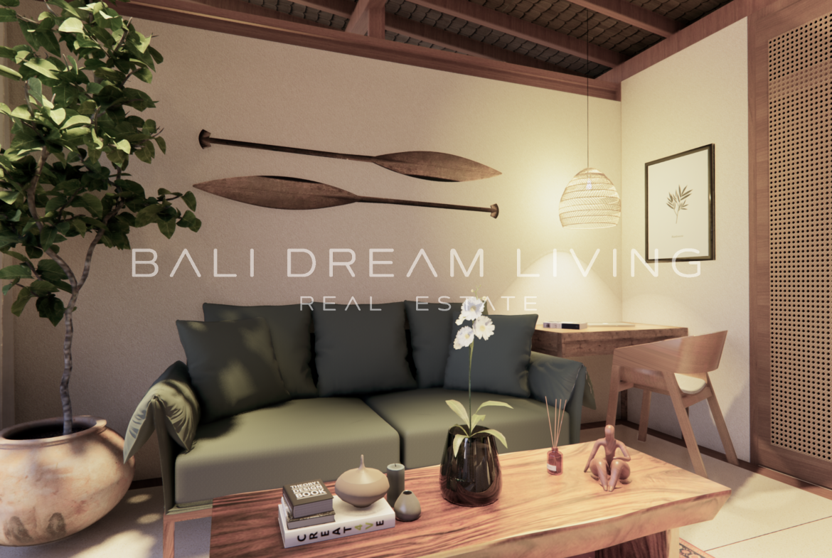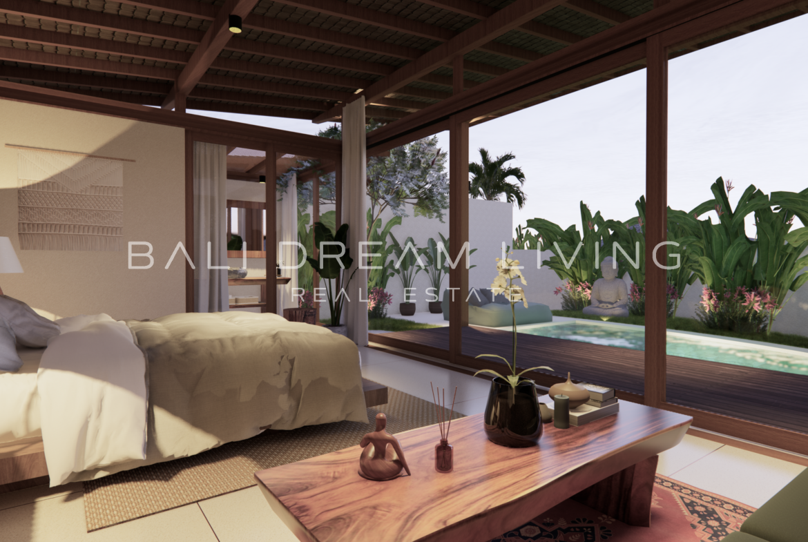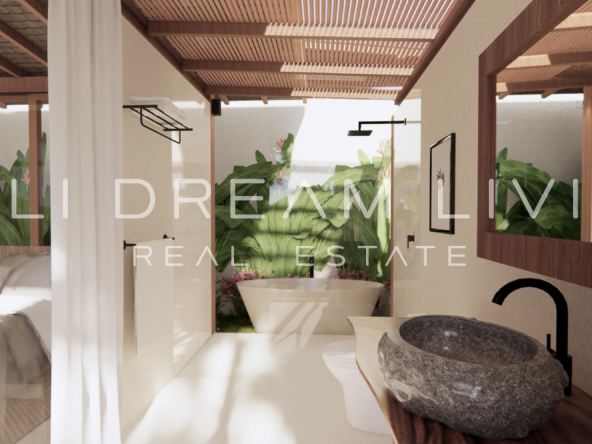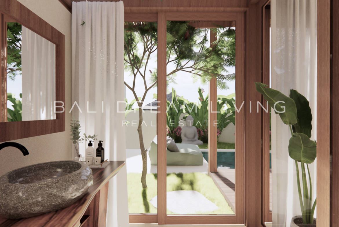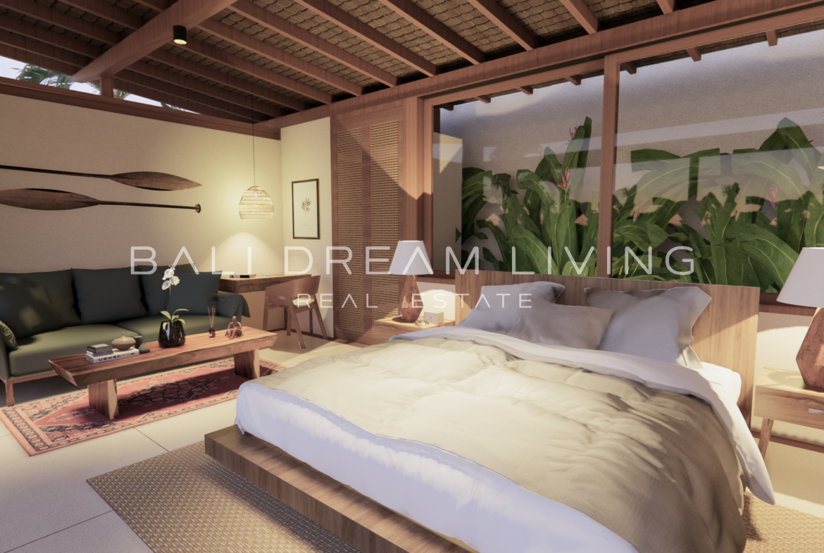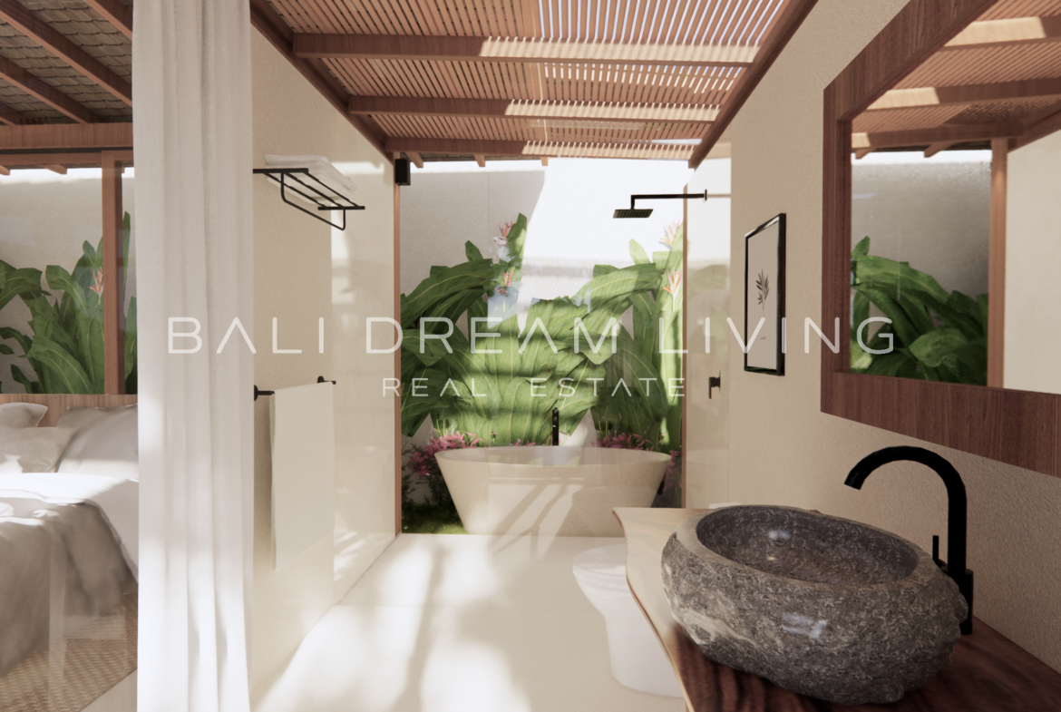 The modern en-suite bathroom complements the villa’s design, ensuring a comfortable and luxurious living experience. This property combines a prime location with peaceful surroundings, making it an ideal choice for a personal retreat or an investment opportunity in Bali.