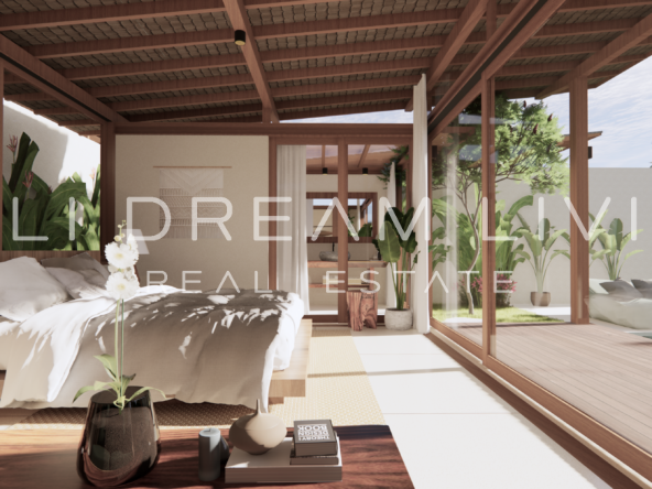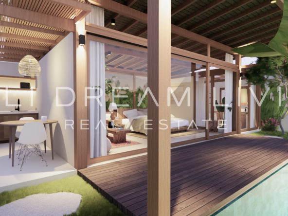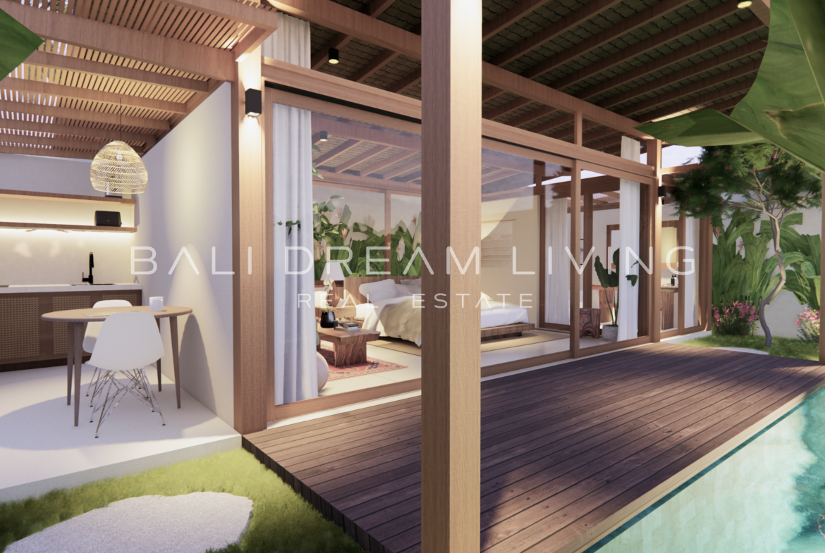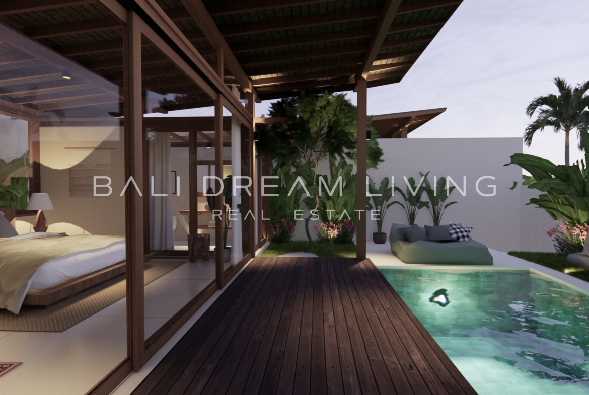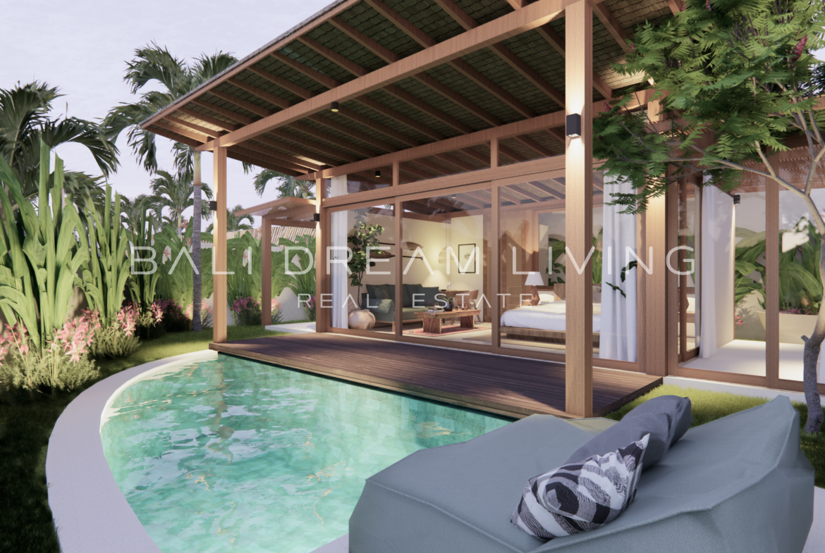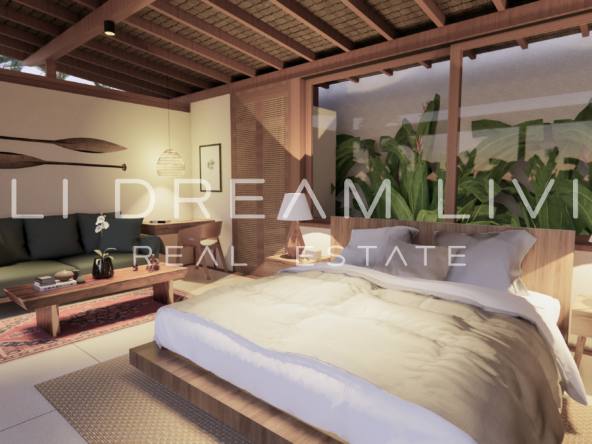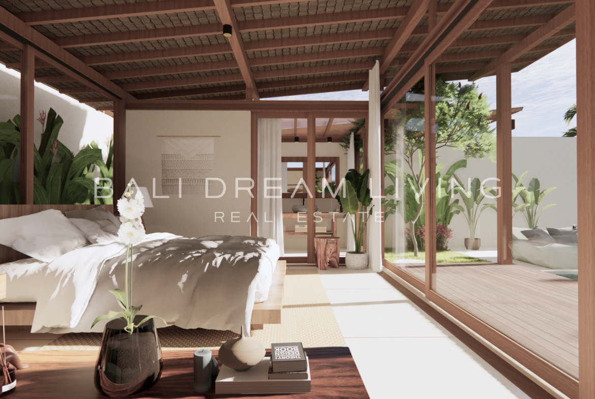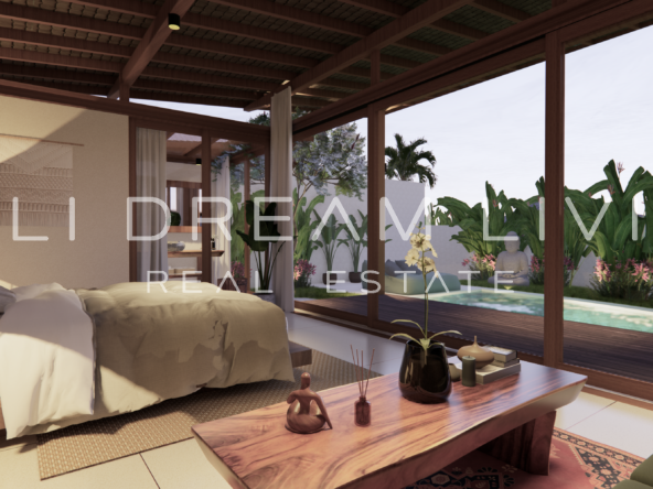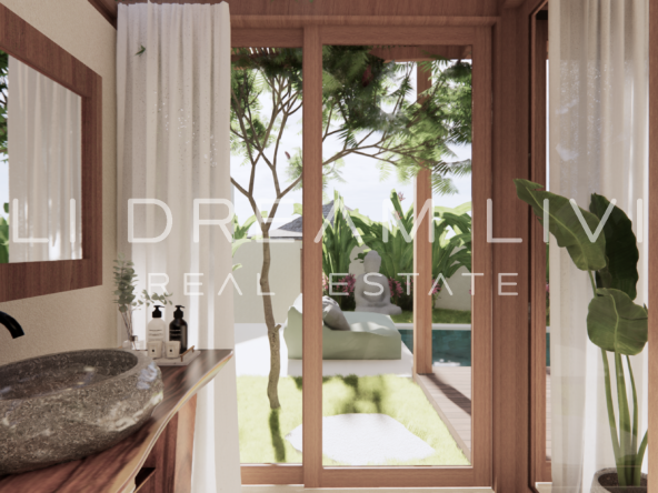 The modern en-suite bathroom complements the villa’s design, ensuring a comfortable and luxurious living experience. This property combines a prime location with peaceful surroundings, making it an ideal choice for a personal retreat or an investment opportunity in Bali.